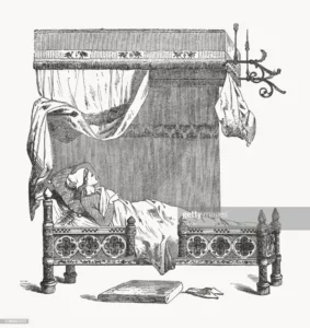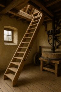 – Il y a une échelle de meunier sous le palier des chambres (soulever sur les côtés le matelas et la planche)